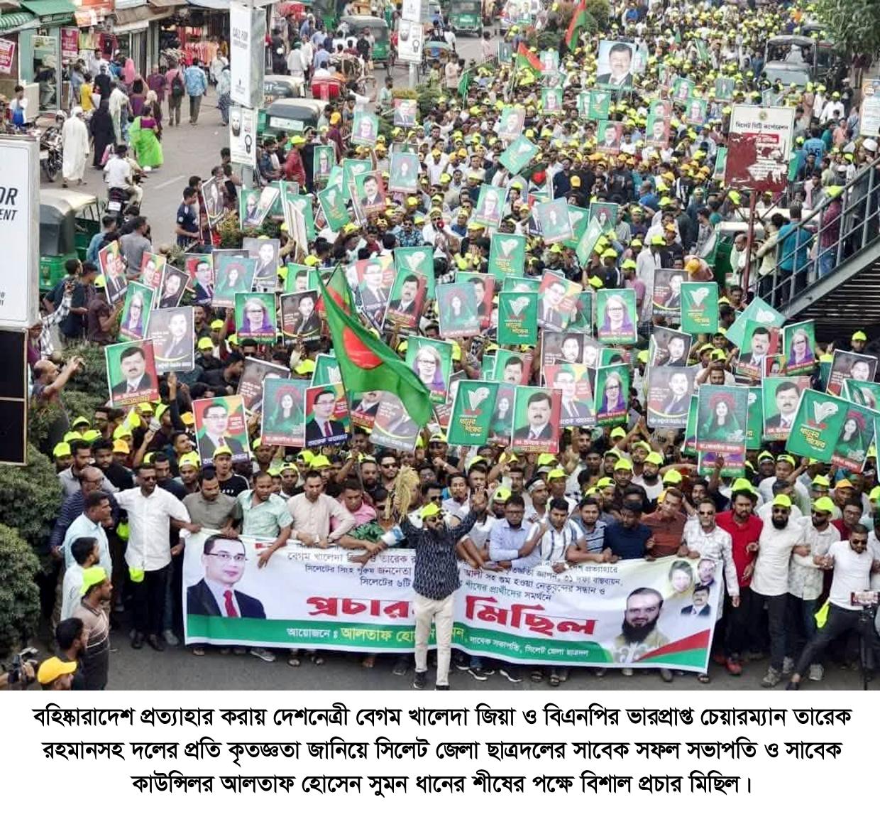 বহিষ্কারাদেশ প্রত্যাহার করায় দেশনেত্রী বেগম খালেদা জিয়া ও বিএনপির ভারপ্রাপ্ত চেয়ারম্যান তারেক রহমানসহ দলের প্রতি কৃতজ্ঞতা জানিয়ে বৃহস্পতিবার (১৩ নভেম্বর) বিকেলে সিলেট রেজিস্ট্রারী মাঠ থেকে সিলেট জেলা ছাত্রদলের সাবেক সফল সভাপতি ও সাবেক কাউন্সিলর আলতাফ হোসেন সুমন ধানের শীষের পক্ষে বিশাল প্রচার মিছিল করেন।