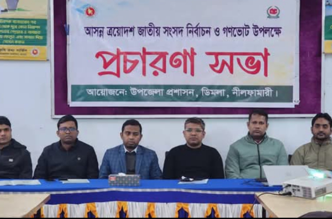 আসন্ন ত্রয়োদশ জাতীয় সংসদ নির্বাচন ও গণভোটকে সামনে রেখে ভোটারদের মধ্যে সচেতনতা বৃদ্ধির লক্ষ্যে নীলফামারী জেলার ডিমলা উপজেলা প্রশাসনের আয়োজনে প্রচারণা সভা অনুষ্ঠিত হয়েছে।