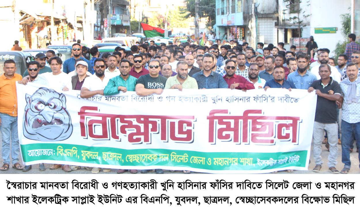 স্বৈরাচার মানবতা বিরোধী ও গণহত্যাকারী খুনি হাসিনার ফাঁসির দাবিতে বিক্ষোভ মিছিল ও প্রতিবাদ সমাবেশ করেছে সিলেট জেলা ও মহানগর শাখার ইলেকট্রিক সাপ্লাই ইউনিটের বিএনপি, যুবদল, ছাত্রদল, স্বেচ্ছাসেবকদলের নেতাকর্মীরা।