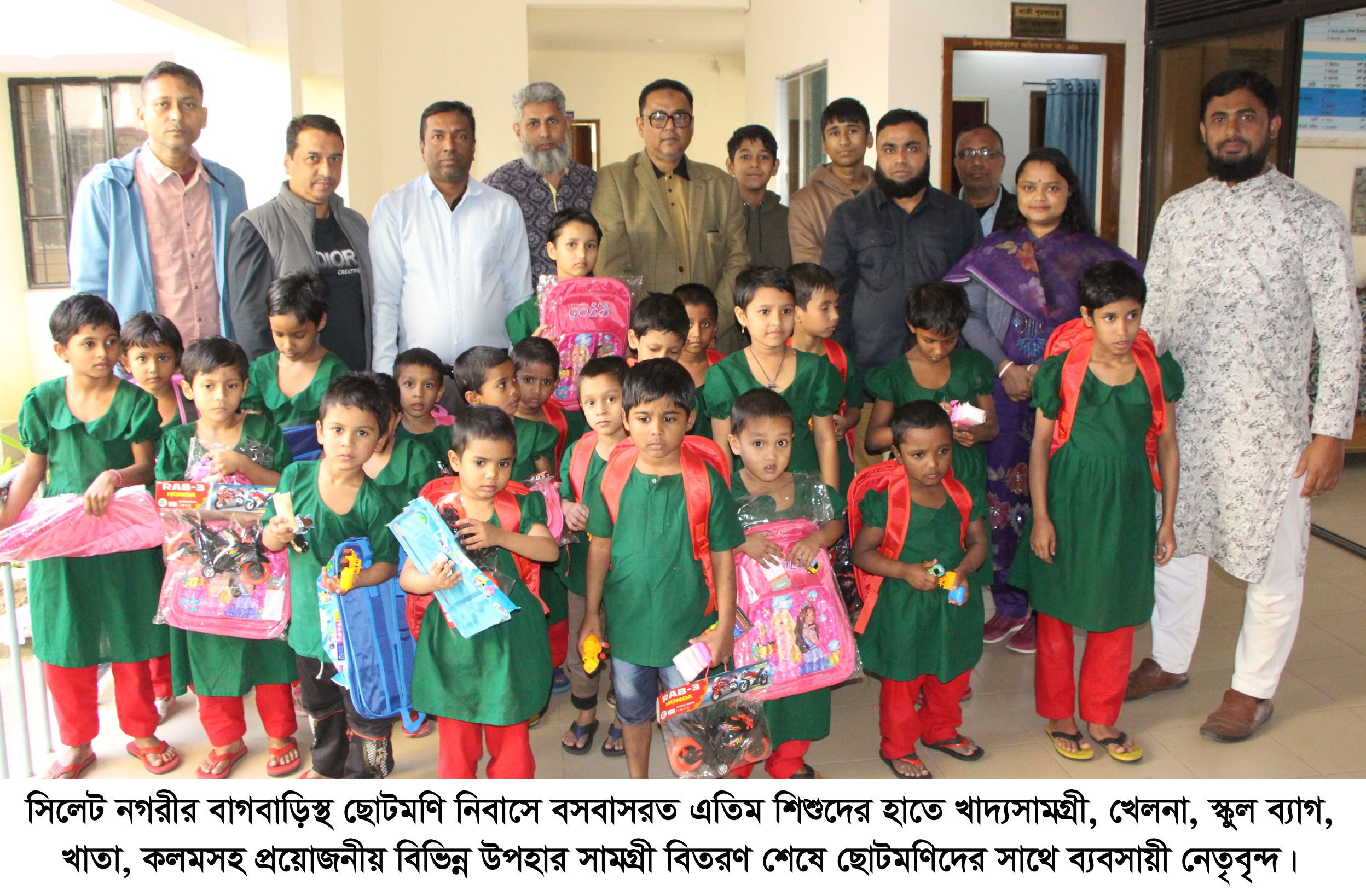সমাজের সুবিধাবঞ্চিত এতিম শিশুদের মুখে হাসি ফোটাতে মানবিক উদ্যোগ গ্রহণ করেছেন সিলেটের ব্যবসায়ী নেতৃবৃন্দ। ছোটমণি নিবাসে বসবাসরত এতিম শিশুদের মাঝে খাদ্যসামগ্রী, খেলনা, স্কুল ব্যাগ, খাতা, কলমসহ প্রয়োজনীয় বিভিন্ন উপহার সামগ্রী বিতরণ করা হয়েছে।