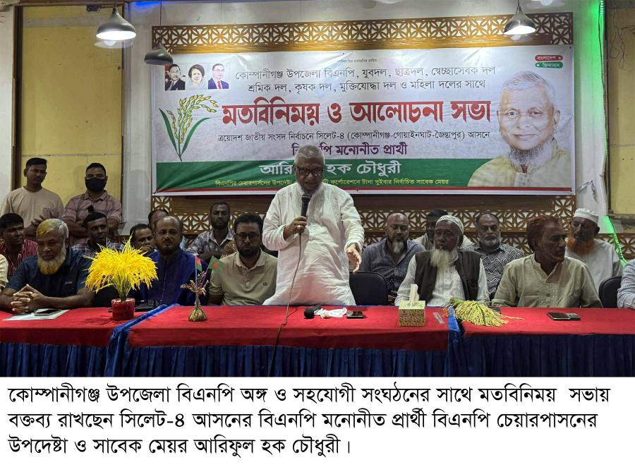 ত্রয়োদশ জাতীয় সংসদ নির্বাচন উপলক্ষে সিলেটের কোম্পানীগঞ্জ উপজেলা বিএনপি, যুবদল, ছাত্রদল, স্বেচ্ছাসেবক দল, শ্রমিকদল, কৃষকদল ও মহিলাদলের সাথে মতবিনিময় করেছেন বিএনপির এমপি পদপ্রার্থী আরিফুল হক চৌধুরী।