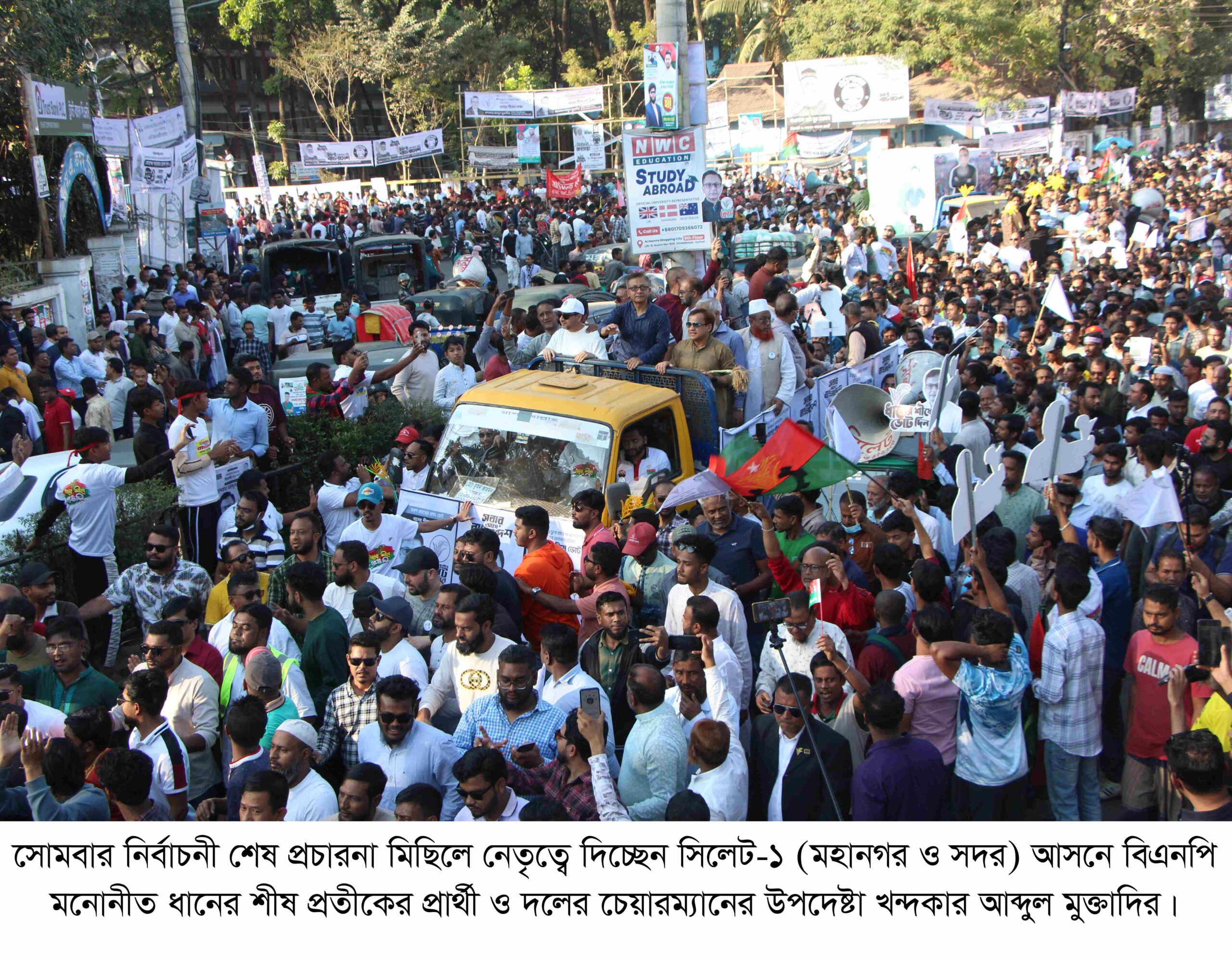 জাতীয় সংসদ নির্বাচনে সিলেট-১ আসনে বিএনপি মনোনীত ধানের শীষের প্রার্থী খন্দকার আব্দুল মুক্তাদিরের প্রচারণার শেষ গণমিছিল ইতিহাস সৃষ্টি করেছে। জনতার বাঁধভাঙা জোয়ারে সিলেটে স্মরণকালের সবচেয়ে বৃহৎ মিছিল হয়েছে। উচ্ছ্বাস আর আনন্দের মিশেলে সিলেট নগরীর কয়েক কিলোমিটার এলাকাজুড়ে বিস্তৃত ছিল এই গণমিছিল।