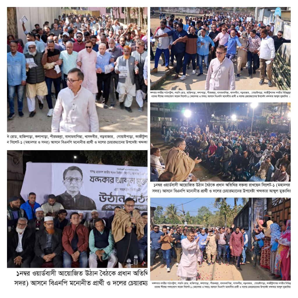 বিএনপির সংসদ সদস্য প্রার্থী খন্দকার আব্দুল মুক্তাদিরের নেতৃত্বে সিলেট নগরীর পাঠানটুলা এলাকা থেকে শুরু হওয়া এই মিছিল কয়েক কিলোমিটার এলাকাজুড়ে ছড়িয়ে পড়ে। পাঠানটুলা থেকে মসজিদ গলি, মোহনা আবাসিক এলাকা, লন্ডনী রোড, সুবিদবাজার, হাজীপাড়া, বনকলাপাড়া, পীরমহল্লা, খাসদবীসহ বিভিন্ন এলাকায় হাজার হাজার মানুষের অংশগ্রহণে এই মিছিল অনুষ্ঠিত হয়। মিছিল চলাকালে বিভিন্ন এলাকার বাসা-বাড়ি থেকে খন্দকার আব্দুল মুক্তাদিরকে ফুল ছিটিয়ে স্বাগত জানান নানা বয়সী মহিলারা। খন্দকার মুক্তাদির তাদের সঙ্গে কথা বলেন। বিভিন্ন শ্রেণি-পেশার এসব মহিলা তাঁকে জানান, দীর্ঘ প্রায় দেড় যুগ তারা ভোট দিতে পারেননি। এবার ধানের শীষে ভোট দিতে তারা অধীর আগ্রহে অপেক্ষা করছেন। ধানের শীষ বিজয়ী হলে উন্নয়ন বঞ্চিত সিলেটের মানুষের জন্য কাজ করবে বলে তারা প্রত্যাশা ব্যক্ত করেন।