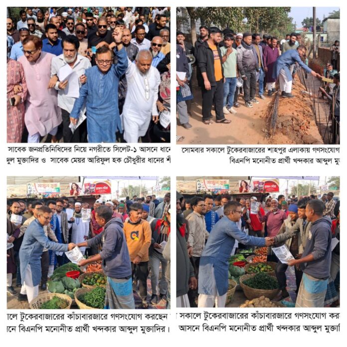 এদিকে সকাল ৮টা থেকে টুকেরবাজারের কাঁচাবারজার থেকে খন্দকার মুক্তাদির গণসংযোগ শুরু করেন। পরে মহানগর ও সদরের বিভিন্নস্থানে নির্বাচনী প্রচারণায় অংশগ্রহণ করেন। এসময় উপস্থিত ছিলেন সদর উপজেলা বিএনপির সাধারণ সম্পাদক আজিজুর রহমান, জালালাবাদী থানা বিএনপির আহবায়ক শহীদ আহমদ, জেলা শ্রমিক দলের সাধারণ সম্পাদক মো. নুরুল ইসলাম, জেলা যুবদলের সহ-সভাপতি আব্দুস সালাম, জেলা ছাত্রদল সহ-সভাপতি নোমান আহমদ প্রমুখ।