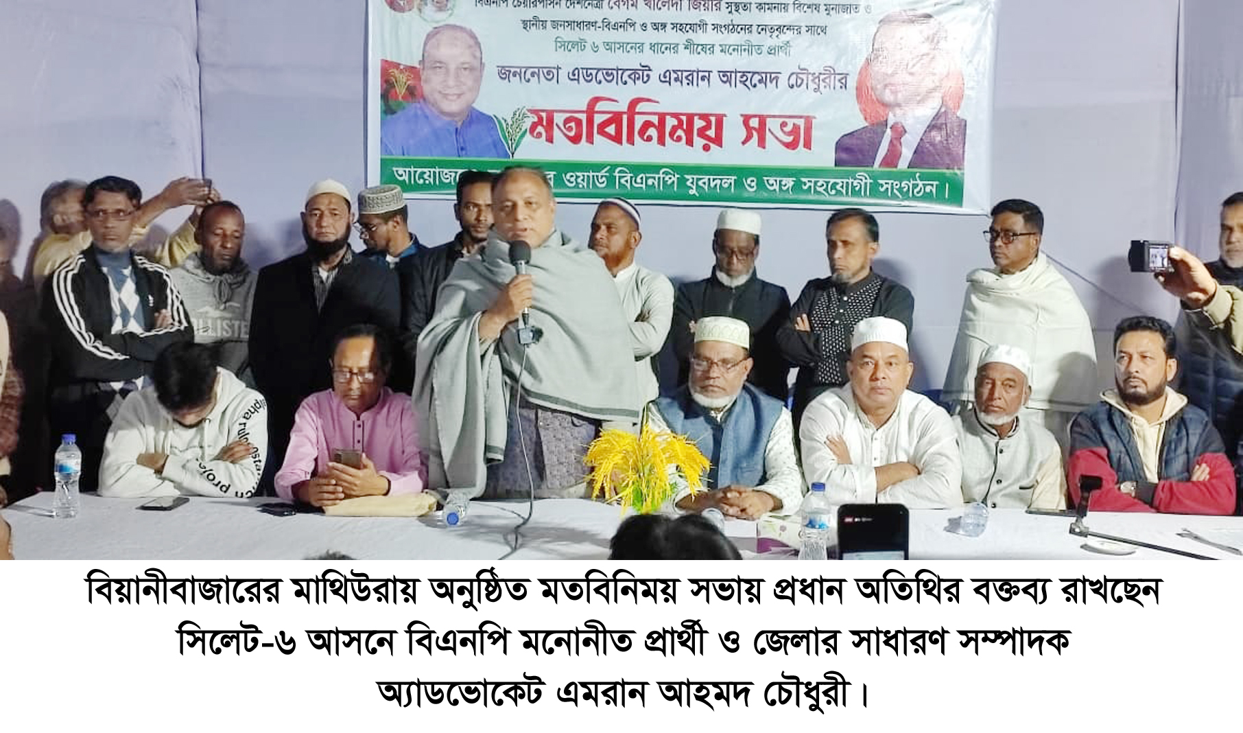 শনিবার (২৯ নভেম্বর) রাত ও রবিবার (৩০ নভেম্বর) দিনে গোলাপগঞ্জ-বিয়ানীবাজারে অনুষ্ঠিত বিভিন্ন উঠানবৈঠক ও দোয়া মাহফিলে প্রধান অতিথির বক্তব্যে এ কথা বলেন সিলেট-৬ আসনে বিএনপি মনোনীত প্রার্থী ও জেলার সাধারণ সম্পাদক অ্যাডভোকেট এমরান আহমদ চৌধুরী।