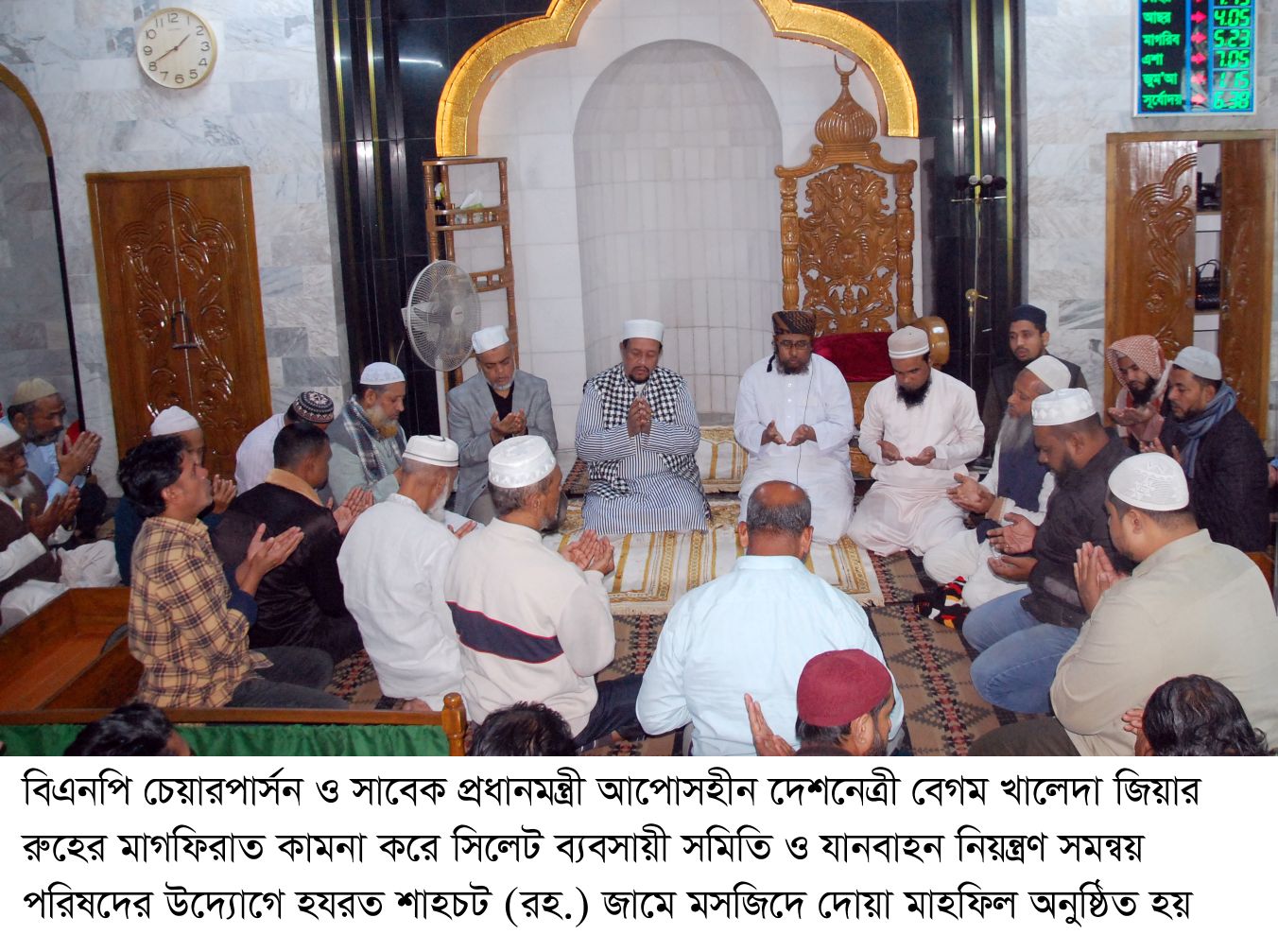 বিএনপি চেয়ারপার্সন ও সাবেক প্রধানমন্ত্রী আপোসহীন দেশনেত্রী বেগম খালেদা জিয়ার রুহের মাগফিরাত কামনা করে সিলেট ব্যবসায়ী সমিতি ও যানবাহন নিয়ন্ত্রণ সমন্বয় পরিষদের উদ্যোগে দোয়া মাহফিল অনুষ্ঠিত হয়েছে।