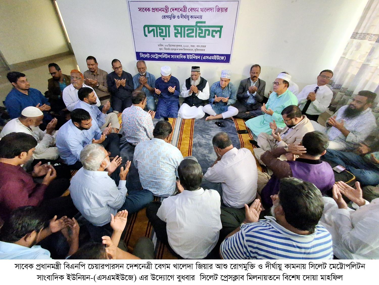 বিএনপি চেয়ারপারসন ও সাবেক প্রধানমন্ত্রী দেশনেত্রী বেগম খালেদা জিয়ার রোগ মুক্তি ও দীর্ঘায়ু কামনায় সিলেট মেট্টোপলিটন সাংবাদিক ইউনিয়ন (এসএমইউজে) এর উদ্যোগে এক বিশেষ দোয়া মাহফিল বুধবার (৩ ডিসেম্বর) সিলেট প্রেসক্লাব ভবনে আয়োজন করা হয়।