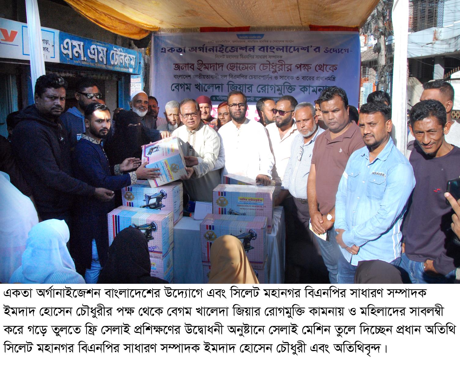 একতা অর্গানাইজেশন বাংলাদেশের উদ্যোগে এবং সিলেট মহানগর বিএনপির সাধারণ সম্পাদক ইমদাদ হোসেন চৌধুরীর পক্ষ থেকে বেগম খালেদা জিয়ার রোগমুক্তি কামনায় ও মহিলাদের দক্ষ সাবলম্বী করে গড়ে তুলতে ফ্রি সেলাই প্রশিক্ষণের উদ্বোধনী অনুষ্টানে প্রধান অতিথির বক্তব্যে তিনি এসব কথা বলেন। সোমবার (৮ ডিসেম্বর) বেলা ২টায় নগরীর সুবিদবাজারের বনকলাপাড়া নূরানী এলাকায় এ অনুষ্টানের আয়োজন করা হয়।