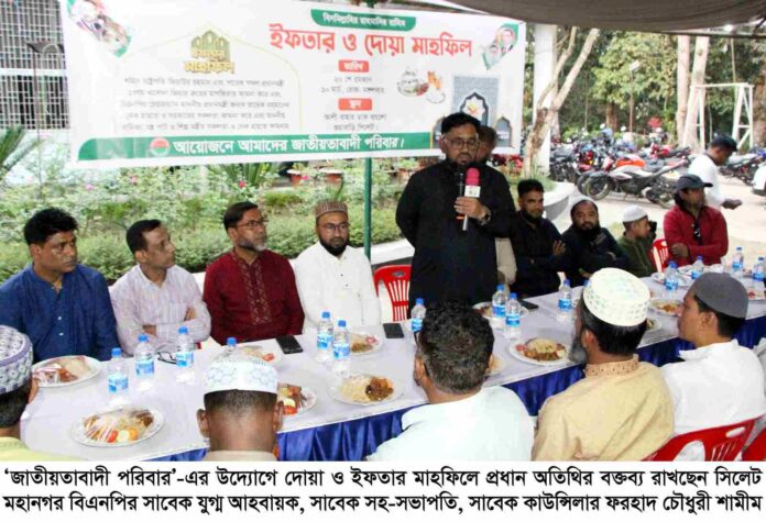 ইফতার ও দোয়া মাহফিলের দোয়া পরিচালনা করেন সিলেট মহানগর যুবদলের সিনিয়র যুগ্ম সম্পাদক এমদাদুল হক স্বপন।