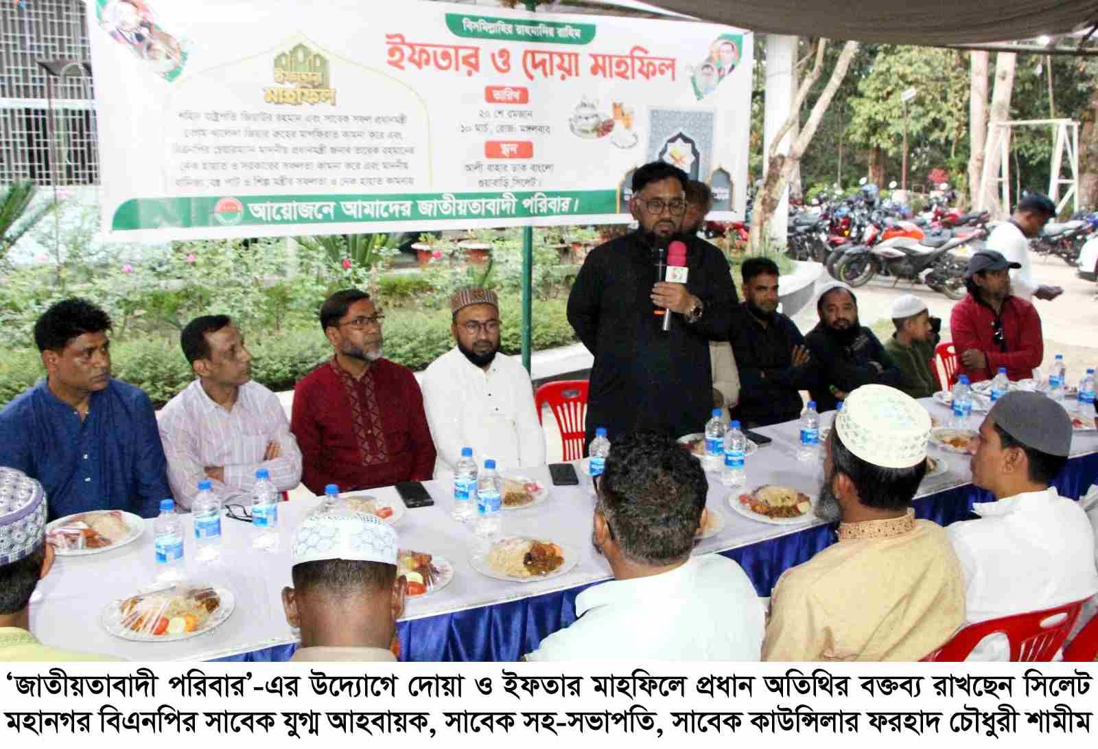 সিলেট নগরীর আলী বাহার ডাক বাংলায় ‘জাতীয়তাবাদী পরিবার’-এর উদ্যোগে এক দোয়া ও ইফতার মাহফিল অনুষ্ঠিত হয়েছে। মঙ্গলবার (১০ মার্চ) আয়োজিত এই ইফতার মাহফিলে শহীদ রাষ্ট্রপতি জিয়াউর রহমান ও সাবেক প্রধানমন্ত্রী মরহুম বেগম খালেদা জিয়ার আত্মার মাগফিরাত কামনায় বিশেষ মোনাজাত করা হয়। পাশাপাশি সিলেটবাসীর প্রিয় নেতা ও বাণিজ্যমন্ত্রী খন্দকার আব্দুল মুক্তাদির এমপি-এর সফলতা ও সুস্বাস্থ্য কামনা করা হয়।