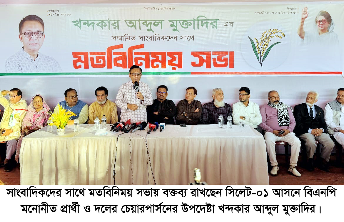 খন্দকার আব্দুল মুক্তাদির (১৪ ডিসেম্বর) রোববার বিকেলে তার নির্বাচনী কার্যালয়ে সিলেটে কর্মরত বিভিন্ন ইলেকট্রনিক ও প্রিন্ট মিডিয়ার সাংবাদিকদের সাথে মতবিনিময় সভায় এ কথা বলেন।
