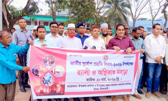 দুর্যোগে প্রস্তুতি, রক্ষা পাবে প্রাণ ও সম্পদ-এই প্রতিপাদ্যকে সামনে রেখে নীলফামারীর ডিমলা উপজেলায় জাতীয় দুর্যোগ প্রস্তুতি দিবস-২০২৬ উপলক্ষে বর্ণাঢ্য র্যালি ও অগ্নিকাণ্ড বিষয়ক মহড়া ও আলোচনা সভা অনুষ্ঠিত হয়েছে। মঙ্গলবার (১০ মার্চ) সকালে ডিমলা উপজেলা প্রশাসন ও উপজেলা প্রকল্প বাস্তবায়ন কর্মকর্তার (পিআইও) কার্যালয়ের উদ্যোগে দিবসটি উপলক্ষে বিভিন্ন কর্মসূচির আয়োজন করা হয়।অনুষ্ঠানে সভাপতিত্ব করেন ডিমলা উপজেলা নির্বাহী কর্মকর্তা (ইউএনও) ইমরানুজ্জামান। প্রধান অতিথি হিসেবে উপস্থিত ছিলেন নীলফামারী-১ (ডোমার-ডিমলা) আসনের সংসদ সদস্য অধ্যক্ষ মাওলানা আব্দুল সাত্তার।