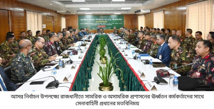 উল্লেখ্য, আসন্ন নির্বাচনকে কেন্দ্র করে নির্বাচনী দায়িত্ব পালনকারী সকল সংস্থার মধ্যে আন্তঃপ্রাতিষ্ঠানিক ও আন্তঃবাহিনী সমন্বয় জোরদার করার লক্ষ্যে সেনাবাহিনী প্রধান গত ২২ জানুয়ারি ২০২৬ তারিখ হতে অদ্যাবধি ঢাকা, চট্টগ্রাম, কুমিল্লা, রংপুর, বগুড়া, বরিশাল, যশোর, কক্সবাজার, সিলেট, ঘাটাইল ও সাভার এরিয়ার ঊর্ধ্বতন পর্যায়ের সামরিক, সকল বিভাগ ও জেলার অসামরিক প্রশাসন এবং বিভিন্ন আইনশৃঙ্খলা রক্ষাকারী বাহিনীর কর্মকর্তাদের সাথে মতবিনিময় করেন।