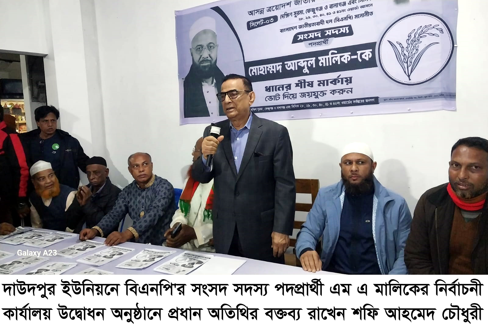 শুক্রবার (২৩ জানুয়ারি) রাতে দক্ষিণ সুরমার দাউদপুর ইউনিয়নে বিএনপি’র সংসদ সদস্য পদপ্রার্থী এম এ মালিকের নির্বাচনী কার্যালয় উদ্বোধন অনুষ্ঠানে প্রধান অতিথির বক্তব্যে শফি আহমেদ চৌধুরী উপরোক্ত কথা বলেন।
