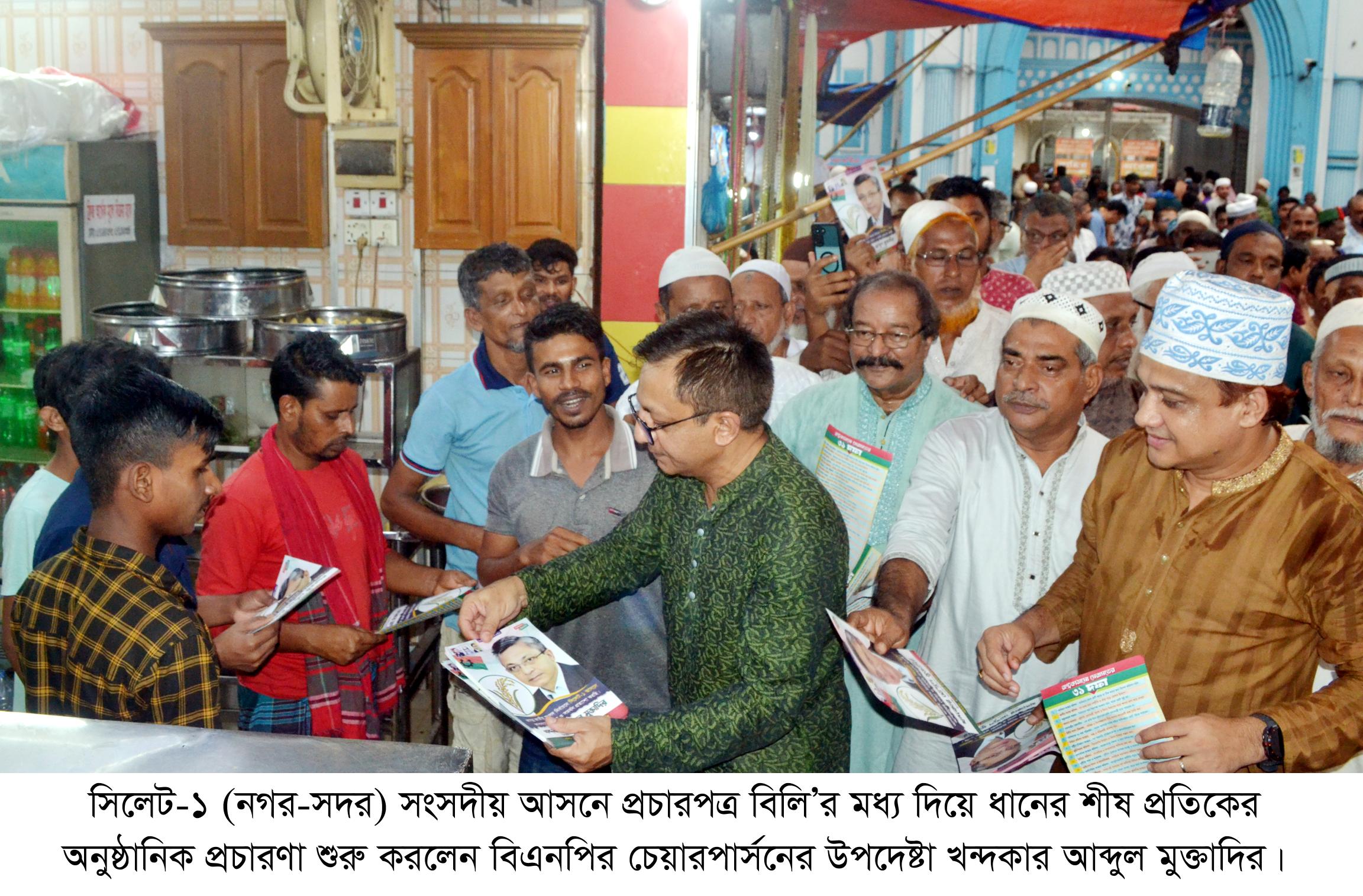 সিলেট-১ (নগর-সদর) সংসদীয় আসনে দোয়া ও প্রচারপত্র বিলির মধ্য দিয়ে ধানের শীষ প্রতিকের অনুষ্ঠানিক প্রচারণা শুরু করেছেন বিএনপির চেয়ারপার্সনের উপদেষ্টা খন্দকার আব্দুল মুক্তাদির।