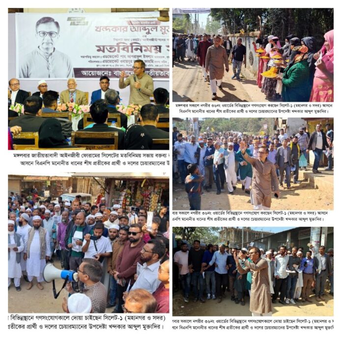 সিলেট-১ আসনে বিএনপি মনোনীত প্রার্থী খন্দকার আব্দুল মুক্তাদির বলেছেন, ‘নির্বাচিত হলে উন্নয়ন কার্যক্রমে শতভাগ জবাবদিহিতা ও স্বচ্ছতা নিশ্চিত করা হবে। বিগত প্রায় দেড় যুগে উন্নয়ন কর্মকাণ্ডে জবাবদিহিতা ও স্বচ্ছতা ছিল না। স্থানীয় মানুষের সম্পৃক্ততাও ছিল না। কিন্তু সামনের দিনে উন্নয়ন কাজে থাকবে জবাবদিহিতা। ফলে কী কাজ হচ্ছে, কেন হচ্ছে, সব জনগণ সহজে জানতে পারবেন। অতীতের মতো আর কসমেটিক বা লোক দেখানো উন্নয়নও হবে না, হবে টেকসই ও দীর্ঘমেয়াদি উন্নয়ন। প্রতিটি এলাকার উন্নয়ন পরিকল্পনা গ্রহণের আগে স্থানীয় গণমান্য ব্যক্তিবর্গ, সামাজিক সংগঠন ও মসজিদের ইমামদের সম্পৃক্ত করা হবে। এতে করে এলাকার প্রকৃত চাহিদা অনুযায়ী কাজ করা সম্ভব হবে।’