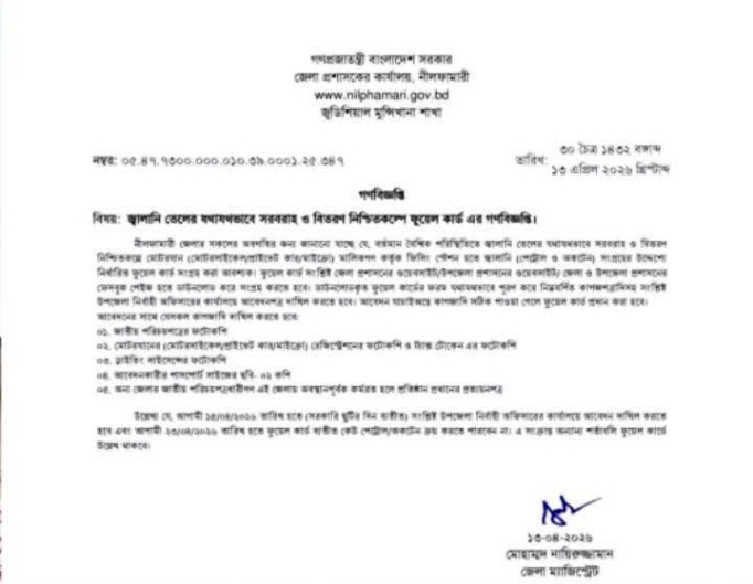 আবেদনের সঙ্গে জাতীয় পরিচয়পত্রের অনুলিপি, যানবাহনের রেজিস্ট্রেশন ও ট্যাক্স টোকেনের কপি, বৈধ ড্রাইভিং লাইসেন্স এবং দুই কপি পাসপোর্ট সাইজের ছবি জমা দিতে হবে। অন্য জেলার জাতীয় পরিচয়পত্রধারী হয়ে নীলফামারীতে কর্মরতদের ক্ষেত্রে সংশ্লিষ্ট প্রতিষ্ঠানের প্রধানের প্রত্যয়নপত্র জমা দেওয়াও বাধ্যতামূলক করা হয়েছে। জেলা প্রশাসন জানায়, ১৫ এপ্রিল ২০২৬ থেকে (সরকারি ছুটির দিন ব্যতীত) আবেদন গ্রহণ শুরু হবে। আর ২৩ এপ্রিল ২০২৬ থেকে ফুয়েল কার্ড ছাড়া কোনো ব্যক্তি ফিলিং স্টেশন থেকে পেট্রোল বা অকটেন সংগ্রহ করতে পারবেন না। এ বিষয়ে জেলা প্রশাসক মোহাম্মদ নায়িরুজ্জামান বলেন, জ্বালানি তেলের সুষ্ঠু ব্যবস্থাপনা নিশ্চিত করা এবং সরবরাহ ব্যবস্থায় স্বচ্ছতা আনতেই এই উদ্যোগ নেওয়া হয়েছে। তিনি নির্ধারিত সময়ের মধ্যে সংশ্লিষ্টদের আবেদন সম্পন্ন করার আহ্বান জানান।