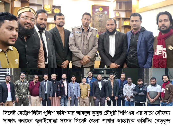 সিলেট মেট্রোপলিটন পুলিশ কমিশনার আবদুল কুদ্দুছ চৌধুরী পিপিএম এর সাথে সৌজন্য সাক্ষাৎ করেছেন জুলাইযোদ্ধা সংসদ সিলেট জেলা’র আহ্বায়ক কমিটির নেতৃবৃন্দ।