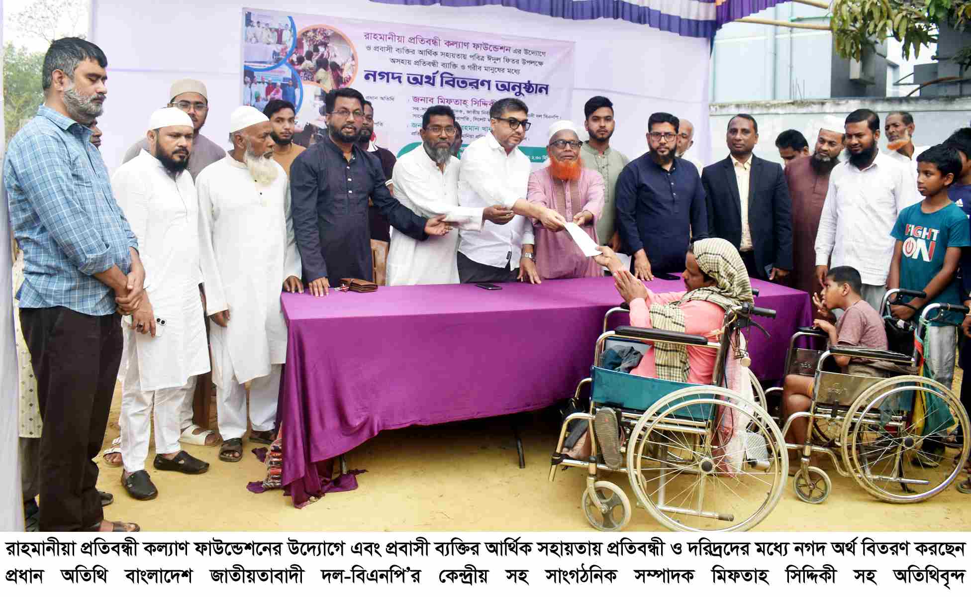 শুরুতে পবিত্র কুরআন থেকে তেলাওয়াত করেন প্রতিবন্ধী আব্দুস সামাদ। অনুষ্ঠানে অসহায় প্রতিবন্ধী ও দরিদ্র মানুষের মাঝে নগদ অর্থ ও শাড়ি বিতরণ করেন প্রধান অতিথি মিফতাহ সিদ্দিকী সহ অন্যান্য অতিথিবৃন্দ। বিজ্ঞপ্তি