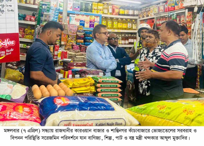বাণিজ্য, শিল্প, পাট ও বস্ত্র মন্ত্রী খন্দকার আব্দুল মুক্তাদির মঙ্গলবার (৭ এপ্রিল) সন্ধ্যায় ভোজ্যতেলের সরবরাহ ও বিপনন পরিস্থিতি সরেজমিন পরিদর্শনে রাজধানীর কারওয়ান বাজার ও শান্তিনগর কাঁচাবাজারে যান।