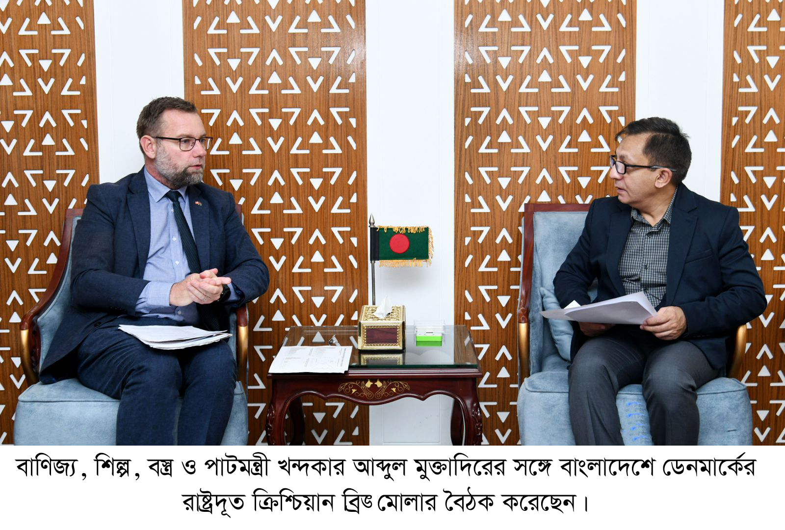 বাণিজ্য, শিল্প, বস্ত্র ও পাটমন্ত্রী খন্দকার আব্দুল মুক্তাদিরের সঙ্গে বাংলাদেশে ডেনমার্কের রাষ্ট্রদূত ক্রিশ্চিয়ান ব্রিক্স মোলার বৈঠক করেছেন। বৃহস্পতিবার (৩০ এপ্রিল) সকালে সচিবালয়ে বাণিজ্যমন্ত্রীর দপ্তরে অনুষ্ঠিত এ বৈঠকে বাংলাদেশ ও ডেনমার্কের মধ্যকার দ্বিপাক্ষিক বাণিজ্য, বিনিয়োগ ও অর্থনৈতিক সহযোগিতা জোরদারের বিভিন্ন দিক নিয়ে ফলপ্রসূ আলোচনা হয়।