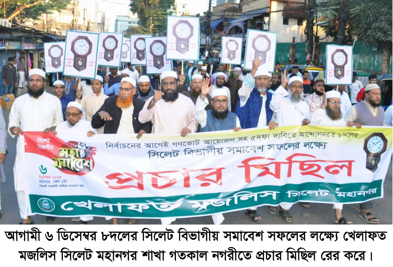 নির্বাচনের আগে গণভোট সহ ৫ দফা দাবিতে আগামী ৬ ডিসেম্বর সিলেট বিভাগীয় সমাবেশ সফলের লক্ষ্যে খেলাফত মজলিস সিলেট মহানগর শাখার প্রচার মিছিল ও সমাবেশে সভাপতির বক্তব্যে তিনি উপরোক্ত কথাগুলো বলেন। আজ ৩ ডিসেম্বর বুধবার বাদ আসর বন্দরবাজার কেন্দ্রীয় জামে মসজিদ থেকে প্রচার মিছিলটি শুরু হয়ে নগরীর গুরুত্বপূর্ণ সড়ক প্রদক্ষিণ শেষে শহীদ মিনারে গিয়ে সমাবেশ অনুষ্ঠিত হয়। মহানগর শাখার সভাপতি হাফিজ মাওলানা তাজুল ইসলাম হাসানের সভাপতিত্বে ও সাংগঠনিক সম্পাদক হাফিজ মাওলানা মনজুরে মাওলার পরিচালনায় অনুষ্ঠিত প্রচার মিছিল পরবর্তী সমাবেশে বক্তব্য রাখেন ও উপস্থিত ছিলেন সিলেট মহানগর সহ-সভাপতি মাওলানা শাহ আশিকুর রহমান, মাওলানা শামসুদ্দিন মুহাম্মদ ইলয়াস, আব্দুল হান্নান তাপাদার, ডা. মুহাম্মদ ফয়জুল হক, সিলেট জেলা সাধারণ সম্পাদক মাওলানা দিলওয়ার হোসাইন, মহানগর সহ-সাধারণ সম্পাদক প্রভাষক আহমদ সাইফুর রহমান, মাসুদ আহমদ, ইসলামী ছাত্র মজলিসের কেন্দ্রীয় প্রতিনিধি পরিষদ সদস্য ও সিলেট মহানগর শাখার সভাপতি মুহিবুর রহমান রায়হান, ইসলামী যুব মজলিস সিলেট মহানগর শাখার সাধারণ সম্পাদক আফজাল হোসাইন কামিল, শ্রমিক মজলিস সিলেট মহানগর শাখার সভাপতি মাওলানা আব্দুর রহিম প্রমুখ।