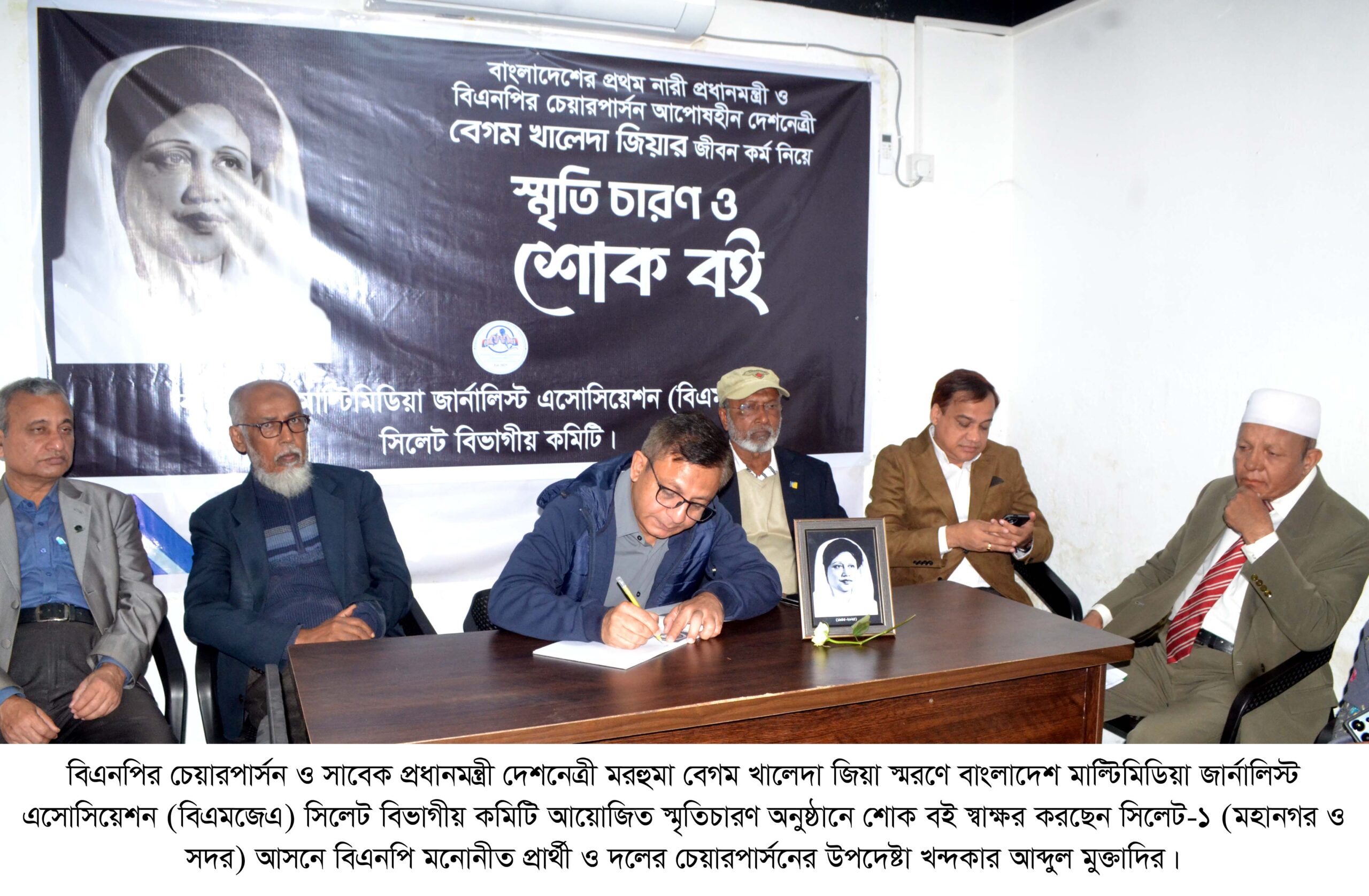 বাংলাদেশ মাল্টিমিডিয়া জার্নালিস্ট এসোসিয়েশন (বিএমজেএ) সিলেট বিভাগীয় কমিটির সভাপতি মোহিদ হোসেনের সভাপতিত্বে ও সাধারণ সম্পাদক মো. নুরুল ইসলামে পরিচালনায় স্মৃতিচারণ করে শোক বইতে স্বাক্ষর করেন সিলেট মহানগর বিএনপির ভারপ্রাপ্ত সভাপতি রেজাউল হাসান কয়েস লোদী, বাংলাদেশ সম্মিলিত পেশাজীবি পরিষদ সিলেট জেলার আহবায়ক ডা. শামীমুর রহমান, সিলেট মেট্রোপলিটন সাংবাদিক ইউনিয়নের সভাপতি বদরুদ্দোজা বদর, সিলেট কৃষি বিশ্ববিদ্যালয়ের প্রফেসার ড. মো. ছিদ্দিকুল ইসলাম, সিলেট প্রেসক্লাবের সিনিয়র সহ-সভাপতি এম এ হান্নান, মহিলা দল কেন্দ্রীয় কমিটির সহ-সভাপতি অধ্যাপিকা সামিয়া বেগম চৌধুরী, জাতীয়তাবাদী আইনজীবি ফোরাম সিলেটের আহবায়ক এডভোকেট শাহ আশরাফুল ইসলাম, সিলেট জেলা মহিলা দলের ভারপ্রাপ্ত সভাপতি তাহসিনা শারমিন তামান্না, সোনালীস্বপ্ন বাংলাদেশের ভাইস প্রেসিডেন্ট আশরাফ গাজী, জাতীয়তাবাদী আইনজীবি ফোরাম সিলেটের সদস্য সচিব এডভোকেট ওবায়দুর রহমান ফাহমি।