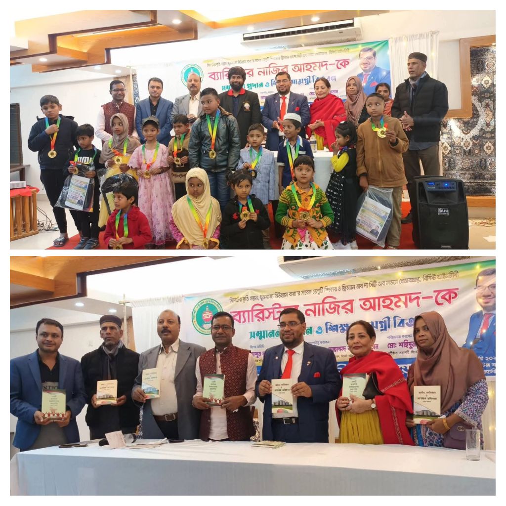 সোমবার ২৬ জানুয়ারি ২০২৬, সন্ধ্যায় সিলেটের এক অভিজাত হোটেলে সিলেট-চট্টগ্রাম ফ্রেন্ডশিপ ফাউন্ডেশনের উদ্যোগে ব্যারিস্টার নাজির আহমদকে সংবর্ধনা এবং শিক্ষার্থীদের মধ্যে শিক্ষা উপকরণ বিতরণ করা হয়।