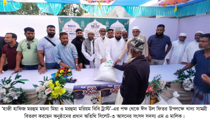 উল্লেখ্য, ‘হাজী হাফিজ মরহুম ময়না মিয়া ও মরহুমা মরিয়ম বিবি ট্রাস্ট’ দীর্ঘ দিন ধরে সিলেট ও সুনামগঞ্জসহ দেশের বিভিন্ন স্থানে অসহায় ও দুস্থ মানুষদের নানাবিধ সহযোগিতা দিয়ে আসছে। এরই ধারাবাহিকতায় প্রতি বছরের ন্যায় এবারও মরহুমা মরিয়ম বিবির নিজ বাড়িতে পবিত্র রমজান উপলক্ষে এলাকার মানুষের মাঝে এই খাদ্য সামগ্রী বিতরণ করা হয়।