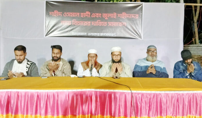 সিলেট নগরীর রায়নগর দপ্তরীপাড়া এলাকাবাসীর উদ্যোগে ইনকিলাব মঞ্চের মুখপাত্র শহীদ ওসমান হাদী ও জুলাই শহীদদের স্মরণে দোয়া মাহফিল ও সমাবেশ অনুষ্টিত হয়েছে। গত সোমবার (১২/০১/২০২৬) রায়নগর দপ্তরীপাড়া এলাকাবাসীর উদ্যোগে ও ইউকে মুসলিম কমিউনিটি এসোসিয়েশন নর্থের দাওয়াহ সেক্রেটারি শাকির আমিম তাহরিমের সার্বিক সহযোগিতায় শহীদ ওসমান হাদি ও জুলাই শহীদদের ন্যায় বিচার প্রাপ্তির দাবিতে সমাবেশ ও দোয়া মাহফিল অনুষ্ঠিত হয়। আপ বাংলাদেশের মৌলভীবাজার জেলার যুগ্ন সদস্য সচিব আব্দুস সামাদ মুন্নার সঞ্চালনায় উক্ত সমাবেশে কুরআন থেকে তেলাওয়াত করেন শাকির আমিম তাহরিম। অতিথি হিসাবে উপস্থিত ছিলেন ইউকে মুসলিম কমিউনিটি এসোসিয়েশন নর্থের ইনচার্জ মাওলানা ফেরদৌস চৌধুরী, সিলেট জেলা এনসিপির যুগ্ম আহবায়ক হিফজুর রহমান খাঁন, সিলেট জেলা জুলাই যুদ্ধা সংসদের আহবায়ক আব্দুর রহিম, আপ বাংলাদেশের কেন্দ্রীয় যুগ্ম প্রধান সংগঠক রিজওয়ানুল বারী, জুলাইয়ের সম্মুখ সারির যোদ্ধা সালাহউদ্দিন মিরাজ, ও স্থানীয় গণ্যমান্য ব্যক্তিবর্গ। দোয়া পরিচালনা করেন দপ্তরিপাড়া জামে মসজিদের সম্মানিত ইমাম হাফিজ মাওলানা আব্দুস শহীদ। প্রধান অতিথির বক্তব্যে মাওলানা ফেরদৌস চৌধুরী বলেন, “আগামী জাতীয় নির্বাচনে যারা শহীদ ওসমান হাদি ও জুলাই শহীদদের ন্যায় বিচার প্রতিষ্ঠার অঙ্গীকার করবে, তাদেরকে আপনারা ভোট দিবেন।” এছাড়াও তিনি গণভোটে “হ্যাঁ” তে সিল মারার জন্য উপস্থিত জনসাধারণকে উদ্ভুদ্ধ করেন। বিশেষ অতিথির বক্তব্যে রিজওয়ানুল বারী বলেন, “রাজধানী ঢাকার বুকে প্রকাশ্য দিবালোকে শহীদ ওসমান হাদির উপর হামলা বাংলাদেশের জাতীয় নিরাপত্তার জন্য হুমকিস্বরূপ।” তিনি ন্যায় বিচার প্রতিষ্ঠায় ব্যর্থ হওয়ায় অন্তর্বতী সরকারের কঠোর সমালোচনা করেন। বিশেষ অতিথির বক্তব্যে সালাহউদ্দিন মিরাজ বলেন, “আধিপত্যবাদ বিরোধী অকুতোভয় সৈনিক শহীদ ওসমান হাদি ছিলেন ইনসাফের মূর্ত প্রতীক, যিনি তার শত্রুর জন্যেও ইনসাফ চেয়েছেন।” সমাবেশে কাজী নজরুলের বিদ্রোহী কবিতা আবৃত্তি করেন জুলাই ওয়ারিয়র্স সিলেট জেলার আহ্বায়ক রেদওয়ান রাফি। সমাবেশ শেষে দপ্তরিপাড়া জামে মসজিদের সম্মানিত ইমাম হাফিজ মাওলানা আব্দুস শহীদ উপস্থিত সকলকে নিয়ে শহীদ ওসমান হাদি ও জুলাই শহীদদের মাগফিরাত কামনায় দোয়া করেন এবং তাদের শাহাদাতের সর্বোচ্চ সম্মান কামনা করেন। বিজ্ঞপ্তি