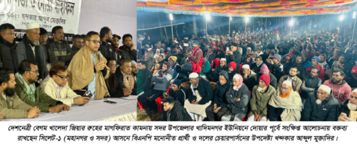 সিলেট-১ (মহানগর ও সদর) আসনে বিএনপি মনোনীত প্রার্থী ও দলের চেয়ারপার্সনের উপদেষ্টা খন্দকার আব্দুল মুক্তাদির বলেছেন, পৃথিবীর ইতিহাসে প্রথম মুসলিম দেশের নারী প্রধান হয়ে গণতন্ত্র ও মানুষের কল্যাণের পাশাপাশি জনগণের সেবা করার জন্য আপসহীন ছিলেন। ভোগ-বিলাশ ও আয়েশ ত্যাগকরে তিনি জনগণের জন্য জীবন বিলিয়ে দিয়েছেন। তাইতো জনগণ তাকে রাজকীয় বিদায় দিয়েছেন। শহীদ জিয়া ও বেগম জিয়ার যে রাজনৈতিক দূরদর্শিতা ছিল সেটা অনুসরণ করে তারেক রহমানের নেতৃত্বে আমাদের সবাইকে কাজ করতে হবে।
