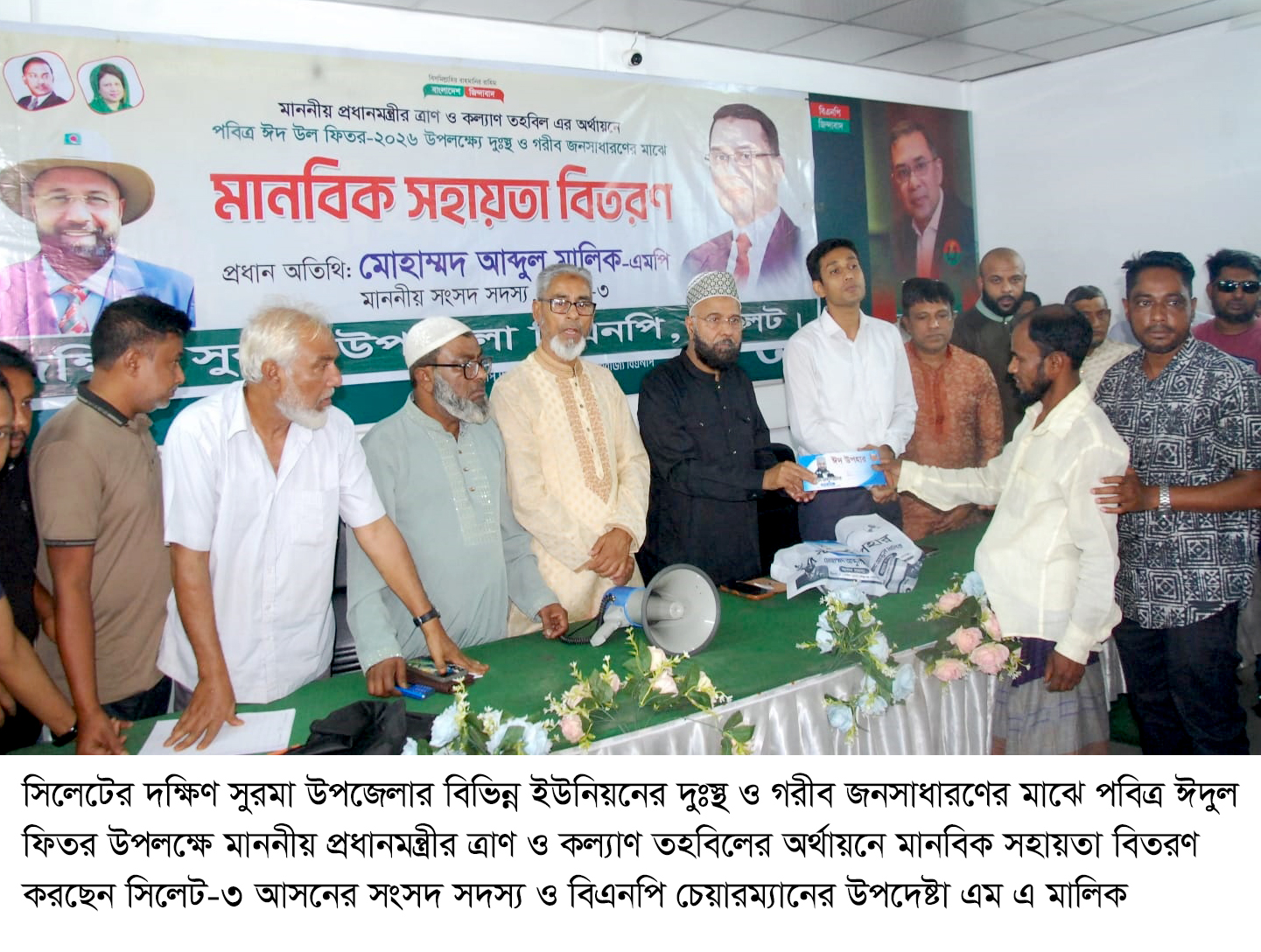 সিলেট-৩ আসনের সংসদ সদস্য ও বিএনপি চেয়ারম্যানের উপদেষ্টা এম এ মালিক বলেছেন, প্রধানমন্ত্রী তারেক রহমানের নেতৃত্বে বর্তমান সরকার দায়িত্ব গ্রহণের পর থেকে জনকল্যাণকে অগ্রাধিকার দিয়ে নানা উদ্যোগ বাস্তবায়ন করছে। নিম্ন আয়ের মানুষের সহায়তায় ফ্যামিলি কার্ড বিতরণ, কৃষকদের জন্য সহজ শর্তে কৃষি ঋণ প্রদান, খাল খনন কর্মসূচির মাধ্যমে জলাবদ্ধতা নিরসন ও কৃষি উৎপাদন বৃদ্ধির উদ্যোগসহ বিভিন্ন কার্যক্রম বাস্তবায়নের মাধ্যমে সরকার মানবিক দৃষ্টান্ত স্থাপন করেছে। তিনি আরও বলেন, প্রধানমন্ত্রীর ত্রাণ তহবিলের মাধ্যমে এবারের ঈদে দরিদ্র মানুষের মুখে হাসি ফুটাতে নগদ অর্থের পাশাপাশি অসহায় নারীদের মাঝে শাড়ি বিতরণ করা হয়েছে। আমরা সবসময় সাধারণ মানুষের পাশে থেকে তদের কষ্ট লাঘবে কাজ করতে চাই। আমাদের সবার সম্মিলিত প্রচেষ্টায় সুখী ও সমৃদ্ধ বাংলাদেশ গড়ে তোলা সম্ভব।