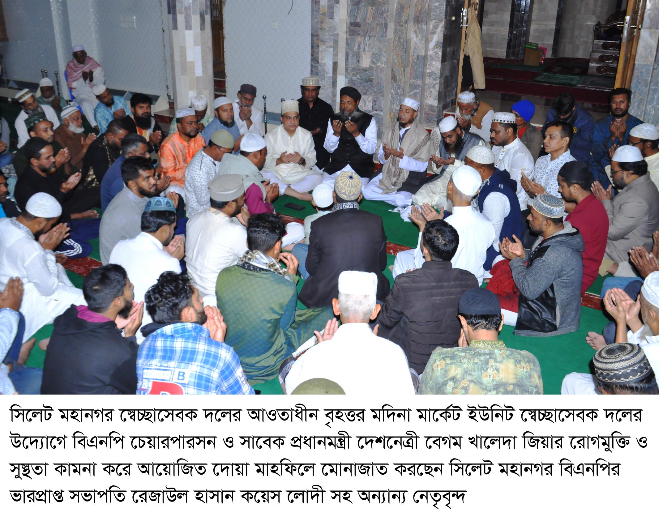 সিলেট মহানগর স্বেচ্ছাসেবক দলের আওতাধীন বৃহত্তর মদিনা মার্কেট ইউনিট স্বেচ্ছাসেবক দলের উদ্যোগে মাদার অফ ডেমোক্রেসি, বিএনপি চেয়ারপারসন ও সাবেক তিন বারের প্রধানমন্ত্রী দেশনেত্রী বেগম খালেদা জিয়ার রোগমুক্তি ও সুস্থতা কামনা করে দোয়া মাহফিল অনুষ্ঠিত হয়েছে।