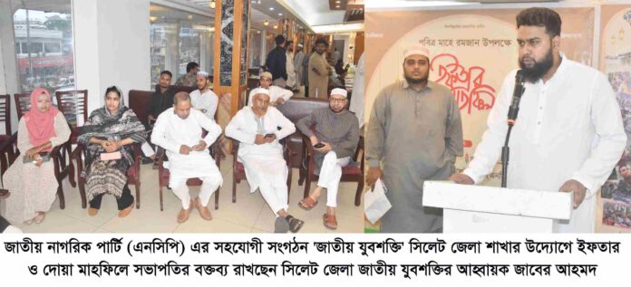 সিলেট জেলা জাতীয় যুবশক্তির আহ্বায়ক জাবের আহমদের সভাপতিত্বে অনুষ্ঠানে প্রধান অতিথির বক্তব্য রাখেন জাতীয় যুবশক্তির কেন্দ্রীয় সংগঠক শাহরিয়ার ইমন সানি।