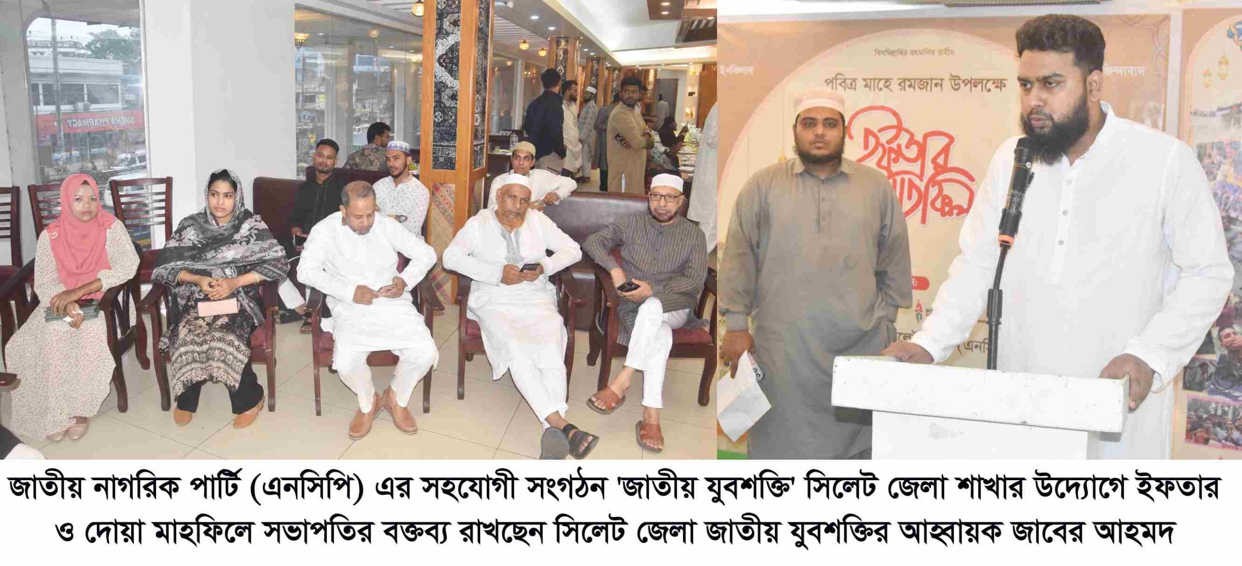 সহযোগী সংগঠন ‘জাতীয় যুবশক্তি’ সিলেট জেলা শাখার উদ্যোগে ইফতার ও দোয়া মাহফিল অনুষ্ঠিত হয়েছে। বৃহস্পতিবার (১২ মার্চ) নগরীর একটি অভিজাত হোটেলের হলরুমে এই মাহফিলের আয়োজন করা হয়।