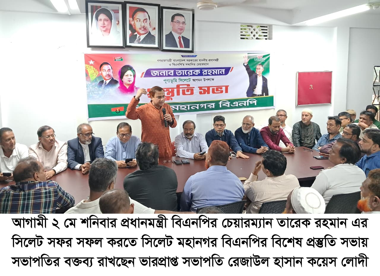 সিলেট মহানগর বিএনপির সাধারণ সম্পাদক মোঃ ইমদাদ হোসেন চৌধুরীর সঞ্চালনায় প্রস্তুতি সভায় বক্তব্য রাখেন ও উপস্থিত ছিলেন মহানগর বিএনপির সাবেক আহ্বায়ক আব্দুল কাইয়ুম জালালি পংকি, সাবেক সাধারণ সম্পাদক বদরুজ্জামান সেলিম, সাবেক সহ-সভাপতি এডভোকেট হাবিবুর রহমান, সহ-সভাপতি জিয়াউল গণি আরেফিন জিল্লুর, জিয়াউল হক জিয়া ও আফজল উদ্দিন,