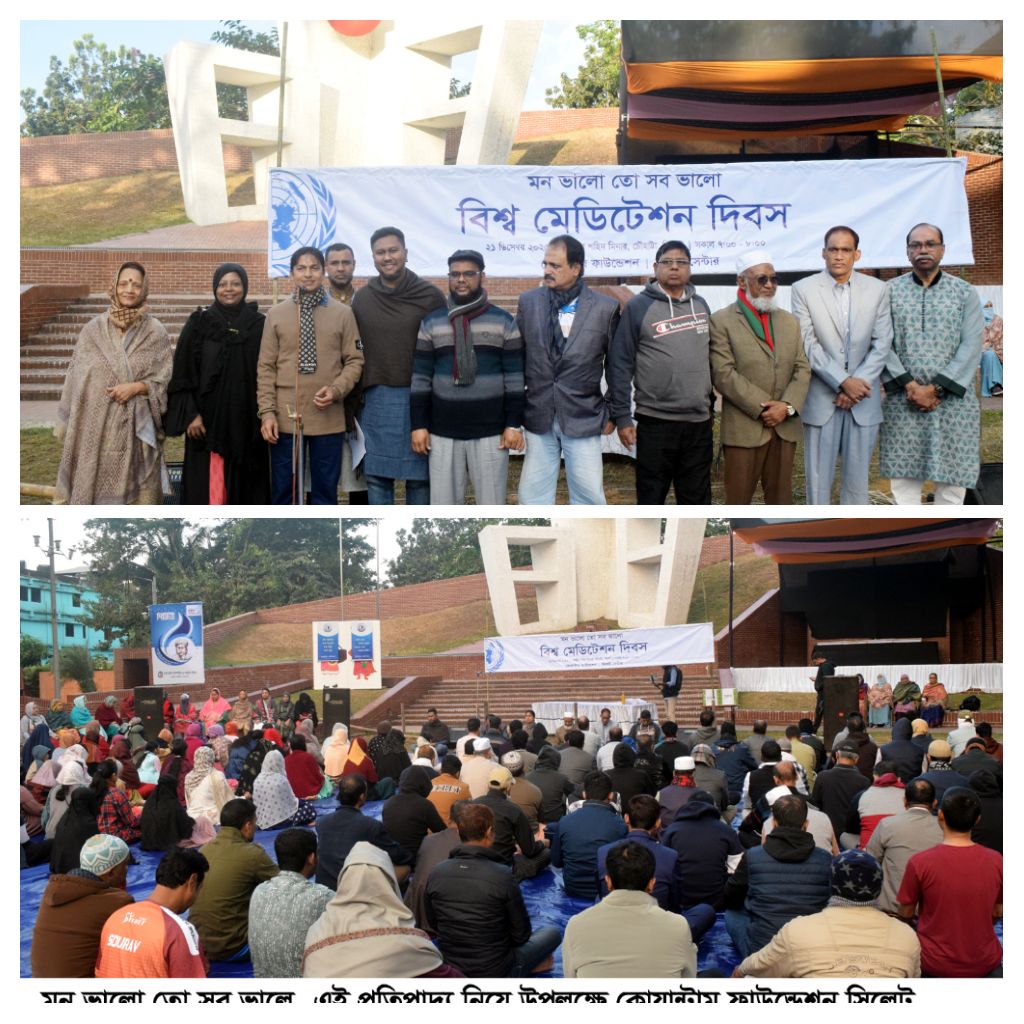 সিলেটে বিশ্ব মেডিটেশন দিবস পালিত হয় নগরীর চৌহাট্টাস্থ কেন্দ্রীয় শহীদ মিনার প্রাঙ্গণে। বাগবাড়ি-জিন্দাবাজার শাখার আর্ডেন্টিয়ার আহমেদ আল নাহিয়ানের সঞ্চালনায় এতে উপস্থিত ছিলেন কোয়ান্টাম ফাউন্ডেশন সিলেট সেন্টারের অর্গানিয়ার-ইনচার্জ ইয়োগা-মেডিটেশন ইন্সট্রাক্টর আহমেদ শরীফ, মোমেন্টিয়ার বীর মুক্তিযোদ্ধা মো: সীতাব আলী, বাগবাড়ি-জিন্দাবাজার শাখার মোমেন্টিয়ার বিশিষ্ট পুস্তক প্রকাশক আজিজুর রহমান খান, আম্বরখানা শাখার মোমেন্টিয়ার লতিফা-শফি চৌধুরী মহিলা ডিগ্রী কলেজের রাষ্ট্রবিজ্ঞান বিভাগের বিভাগীয় প্রধান এবং অ্যাসিস্ট্যান্ট প্রফেসর শেখ মোহাম্মদ আব্দুর রশিদ, উপশহর শাখার আর্ডেন্টিয়ার বাংলাদেশ ব্যাংক সিলেটের সাবেক অতিরিক্ত পরিচালক নৃত্যরঞ্জন দত্ত পুরকায়স্থ সহ সমাজের বিভিন্ন শ্রেণী-পেশার মানুষ। -বিজ্ঞপ্তি