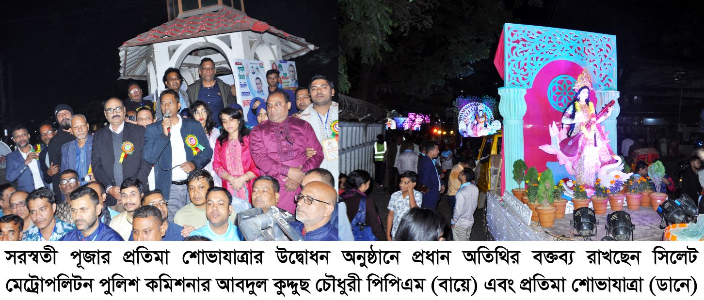 শ্রীশ্রী সরস্বতী পূজা ও শোভাযাত্রা পরিচালনা কমিটির আহ্বায়ক সদীপ রঞ্জন সেন বাপ্পুর সভাপতিত্বে এবং যুগ্ম আহ্বায়ক প্রদীপ কুমার দেবের সঞ্চালনায় এই শোভাযাত্রার উদ্বোধনী অনুষ্ঠানে প্রধান অতিথির বক্তব্য রাখেন, সিলেট মেট্রোপলিটন পুলিশের (এসএমপি) মান্যবর পুলিশ কমিশনার আবদুল কুদ্দুছ চৌধুরী পিপিএম।