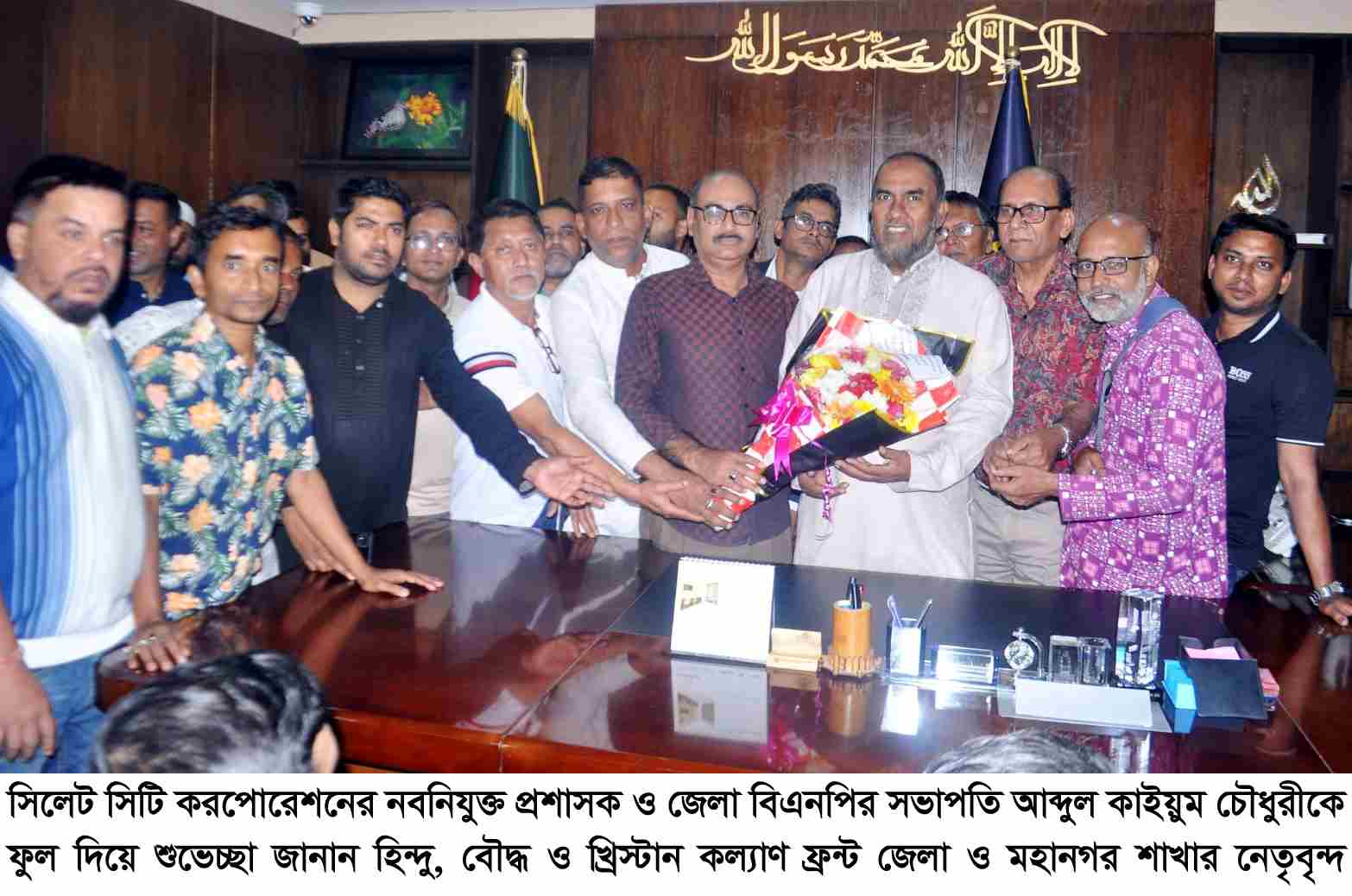 সিলেট সিটি করপোরেশনের (সিসিক) নবনিযুক্ত প্রশাসক ও জেলা বিএনপির সভাপতি আব্দুল কাইয়ুম চৌধুরীকে হিন্দু, বৌদ্ধ ও খ্রিস্টান কল্যাণ ফ্রন্ট’ সিলেট জেলা ও মহানগর শাখার পক্ষ থেকে ফুলেল শুভেচ্ছা ও অভিনন্দন জানানো হয়েছে।