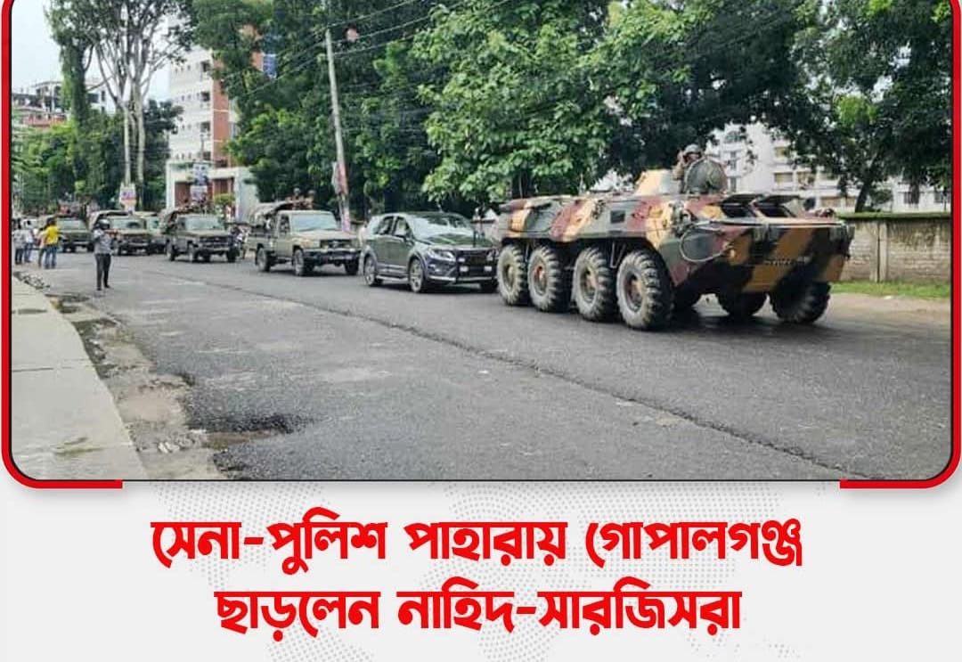 সেনাবাহিনী ও পুলিশের পাহারায় গোপালগঞ্জ ছেড়েছেন জাতীয় নাগরিক পার্টির (এনসিপি) নেতাকর্মীরা। বুধবার (১৬ জুলাই) বিকেল ৫টা পর তারা গোপালগঞ্জ ছেড়ে বের হয়ে যান। এ তথ্য নিশ্চিত করে এনসিপির যুগ্ম সদস্য সচিব মুশফিক উস সালেহিন জানিয়েছেন, কড়া পাহারায় তাদের নিয়ে ১৫ থেকে ১৬টি গাড়ির বহর গোপালগঞ্জ ছাড়ে।