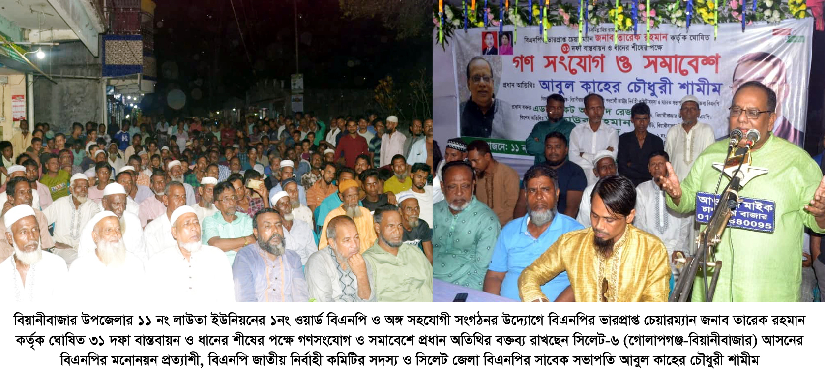 বিয়ানীবাজার উপজেলার ১১ নং লাউতা ইউনিয়নের ১নং ওয়ার্ড বিএনপি সভাপতি আব্দুল মান্নানের সভাপতিত্বে ও সাধারণ সম্পাদক কয়েস আহমদের পরিচালনায় প্রধান বক্তার বিয়ানীবাজার উপজেলা বিএনপি সভাপতি এডভোকেট আহমেদ রেজা, বিশেষ অতিথির বক্তব্য রাখেন, বিয়ানীবাজার উপজেলা বিএনপি সহ-সভাপতি আতাউর রহমান।